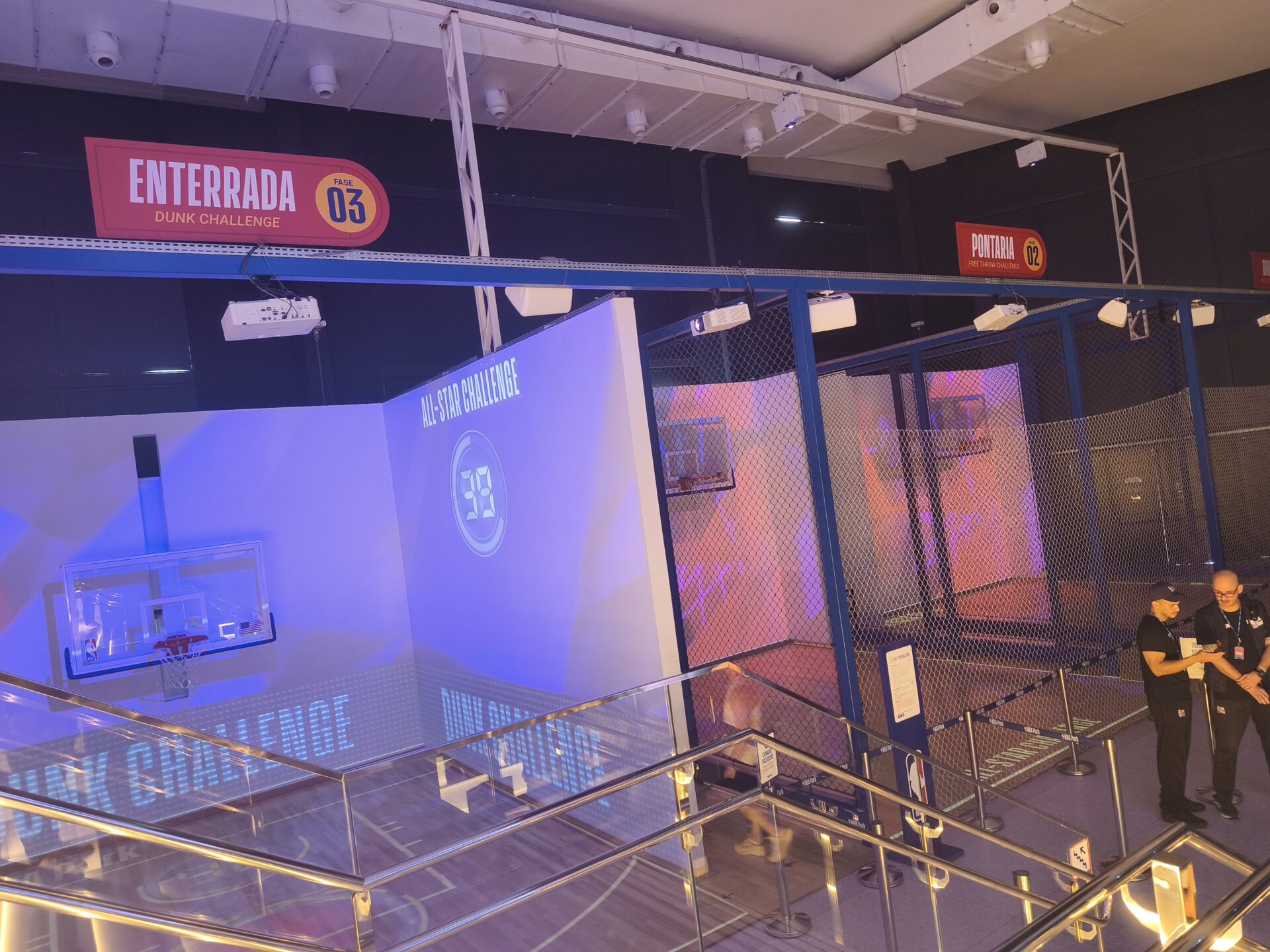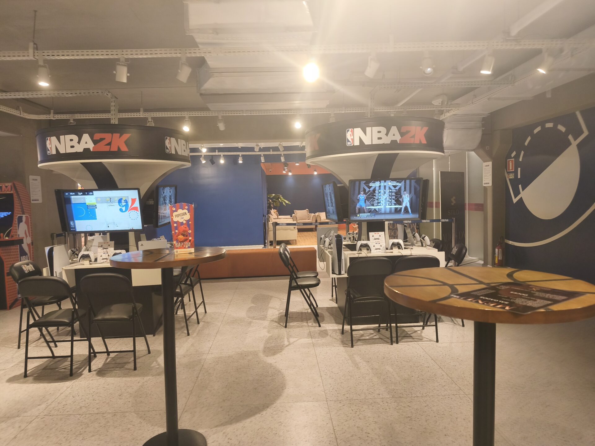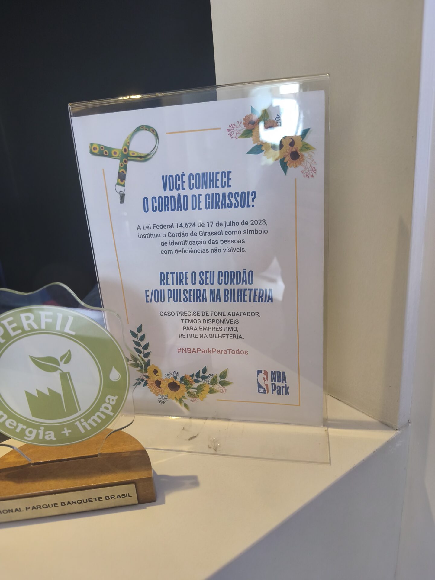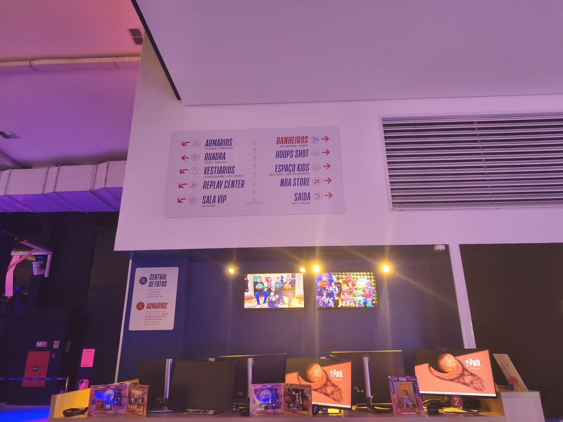 Durante a visita, foi possível identificar alguns recursos que contribuem para uma experiência mais acessível dentro do NBA Park: